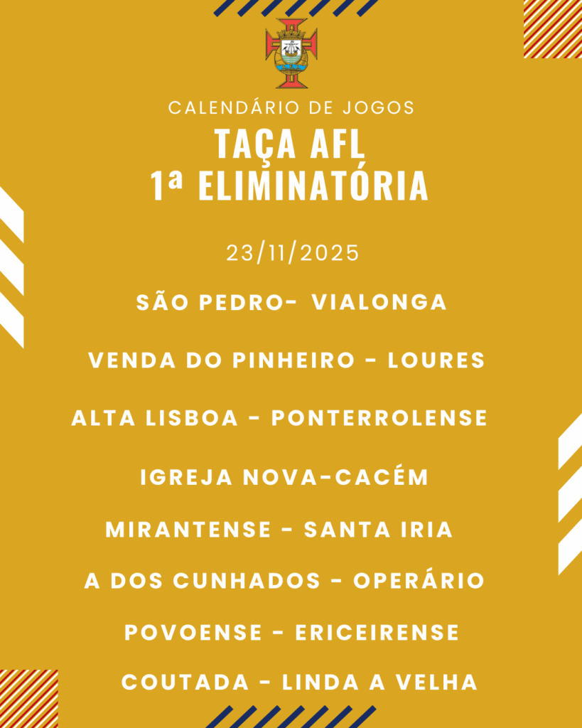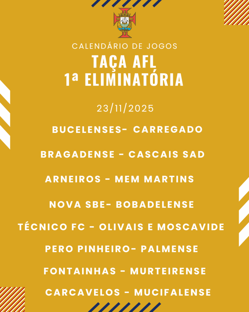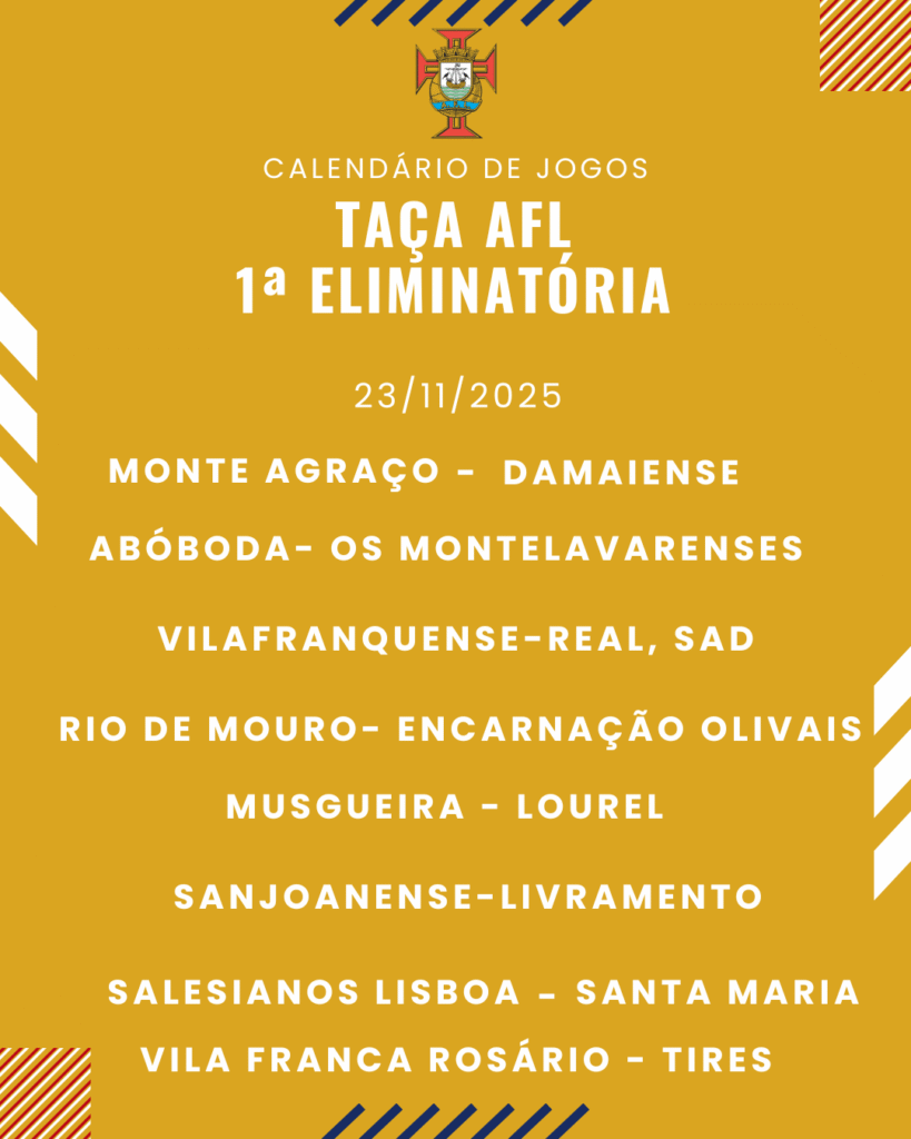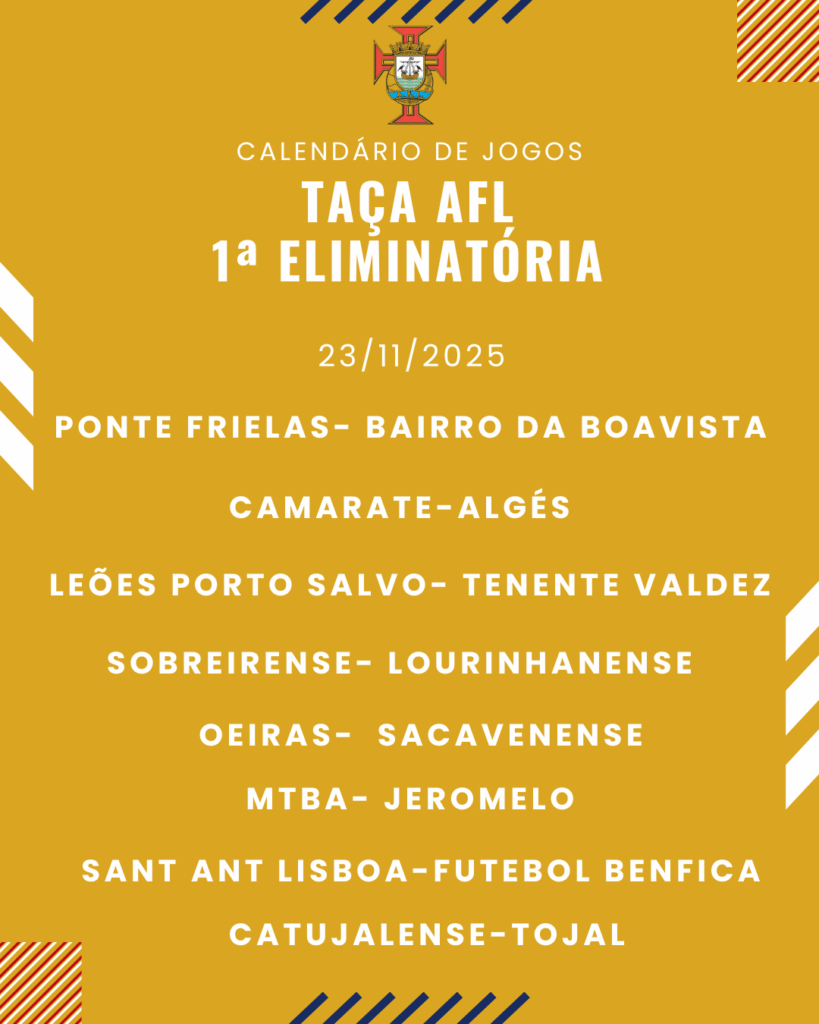 Taça AFL Futebol – 1ªeliminatória Geral Há 15 minutos Os jogos serão disputados no próximo dia 23 de novembro! Boa sorte a todas as equipas! Consulta aqui o calendário de jogos: Partilhar