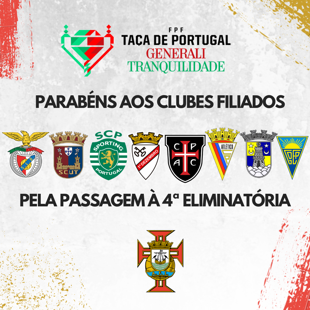 Parabéns aos clubes filiados da Associação de Futebol de Lisboa pela passagem à quarta eliminatória da Taça de Portugal.