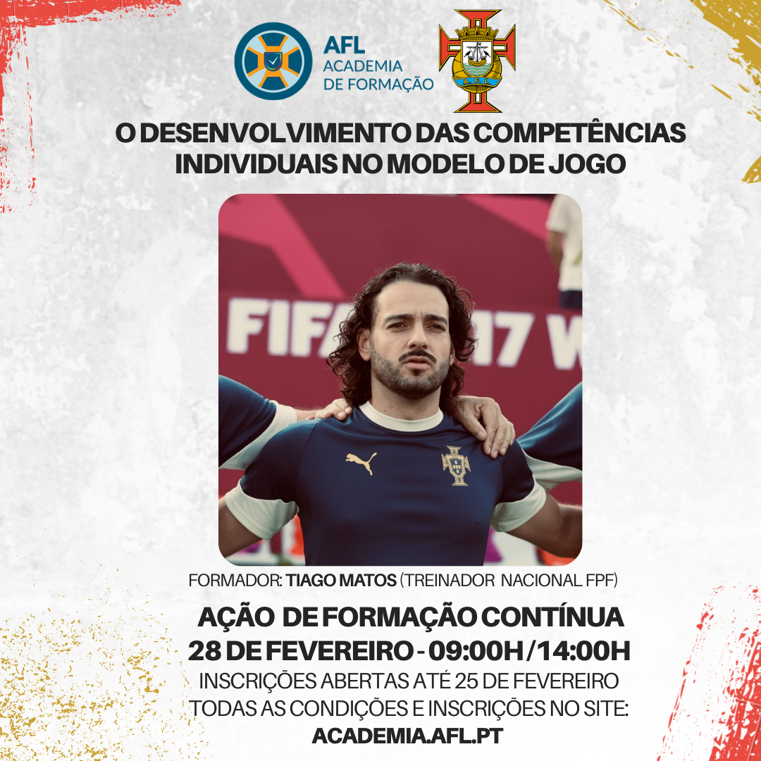 No próximo dia 28 de fevereiro, a Associação de Futebol de Lisboa organiza mais uma ação de formação contínua. “O desenvolvimento das competências individuais no modelo de jogo”, é destinado a treinadores de futebol e será dada pelo formador, Tiago Matos, treinador nacional da Federação Portuguesa de Futebol.