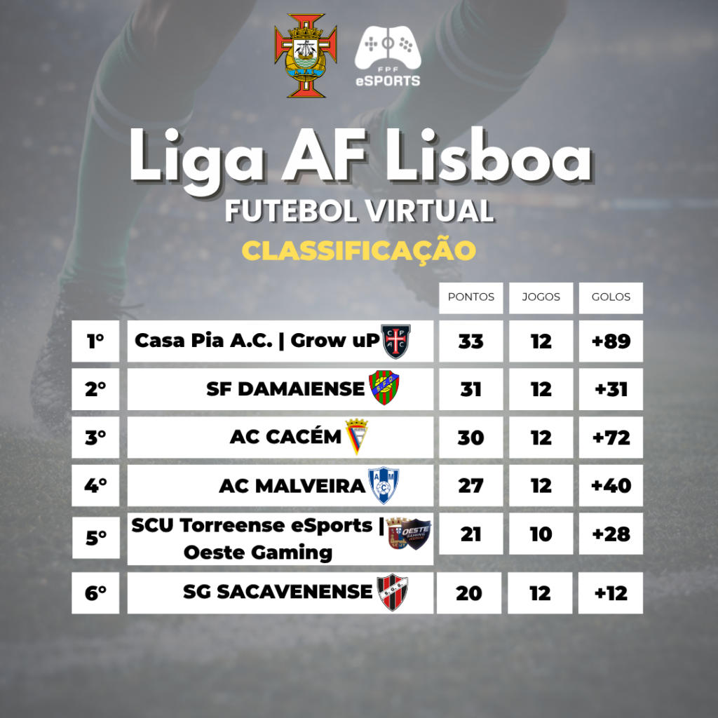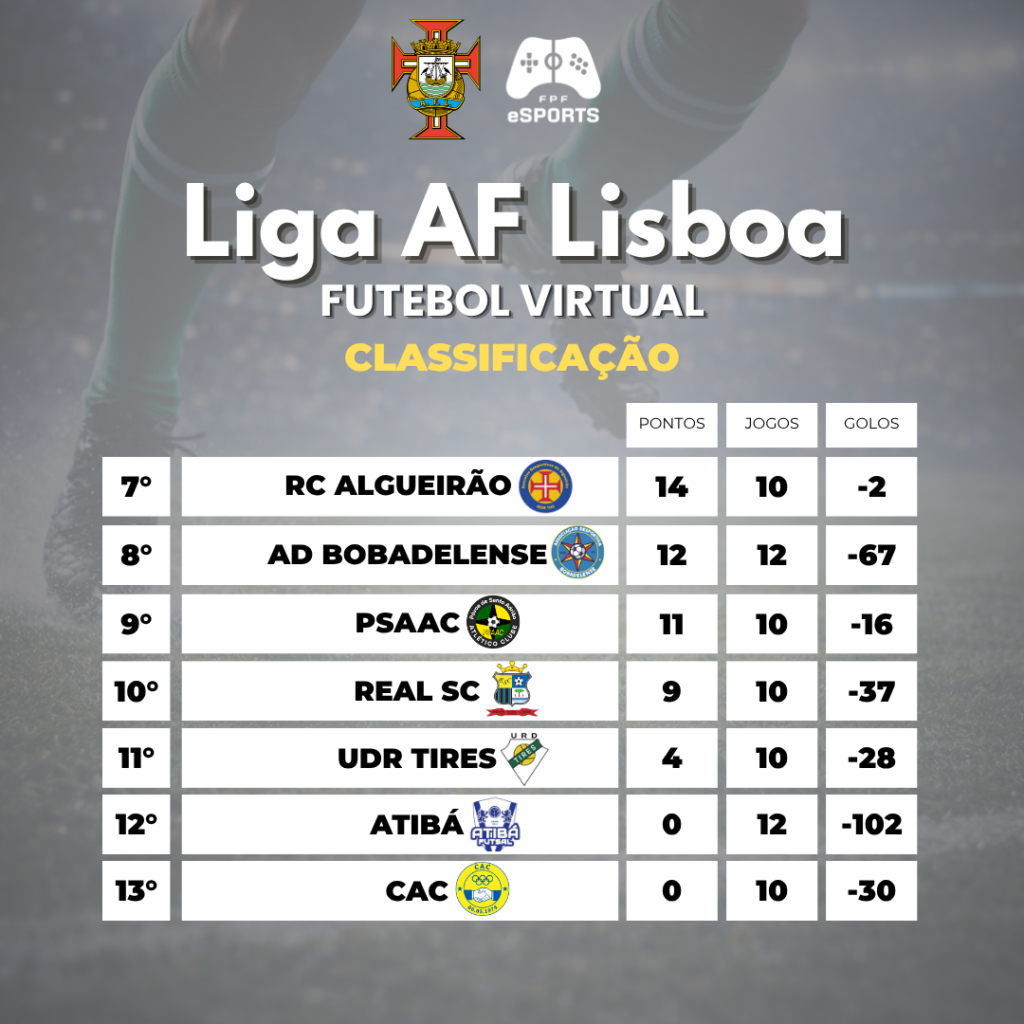 Classificação Liga AF LISBOA FUTEBOL VIRTUAL eSports 13 de Abril, 2026 A classificação da 𝐋𝐈𝐆𝐀 𝐀𝐅 𝐋𝐈𝐒𝐁𝐎𝐀 𝐅𝐔𝐓𝐄𝐁𝐎𝐋 𝐕𝐈𝐑𝐓𝐔𝐀𝐋 a meio da competição: A luta pelo título de campeão está ao rubro! Tags: AF LisboaAFLAssociação de Futebol de LisboaPartilhar