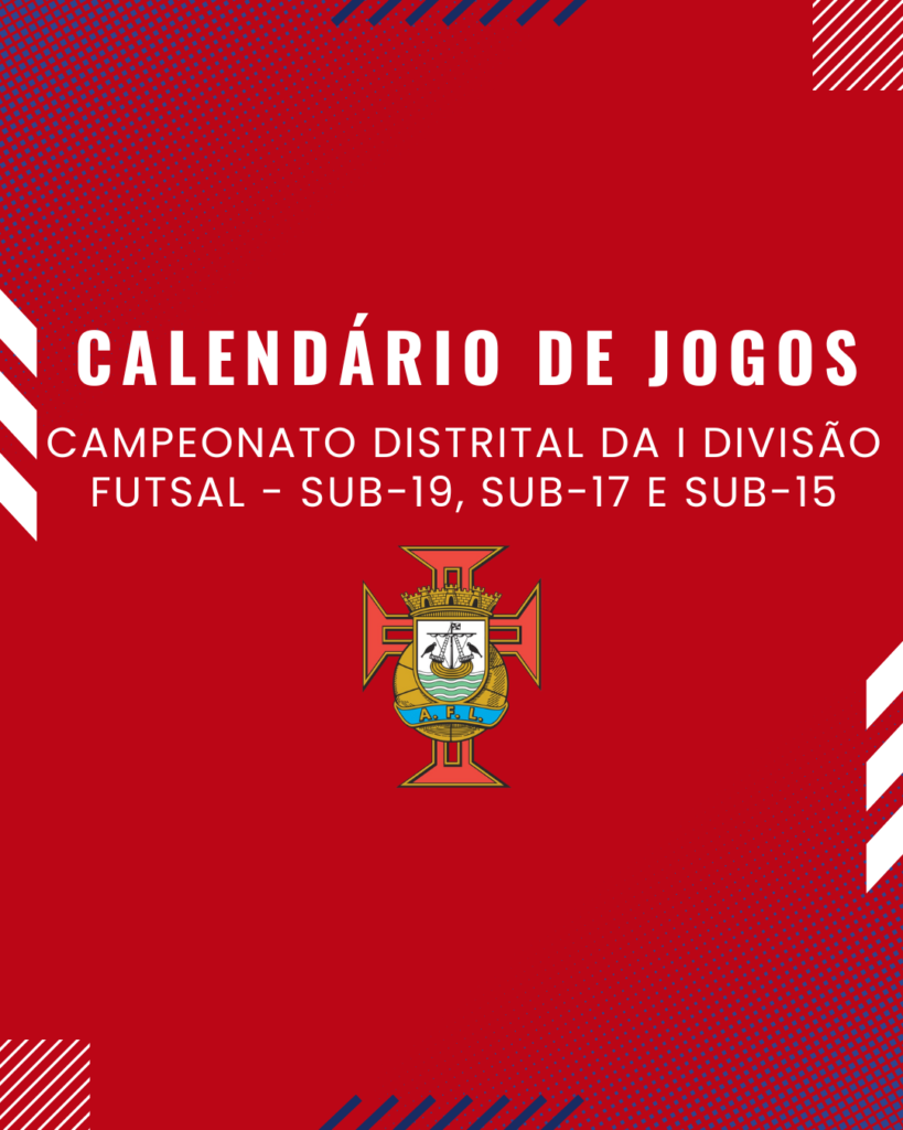 Consulta aqui o calendário completo dos jogos do Campeonato Distrital da I Divisão de Futsal: Sub-19: Consulta aqui o calendário completo dos jogos do Campeonato Distrital da I Divisão de Futsal: Sub-17: Consulta aqui o calendário completo dos jogos do Campeonato Distrital da I Divisão de Futsal: Sub-15: